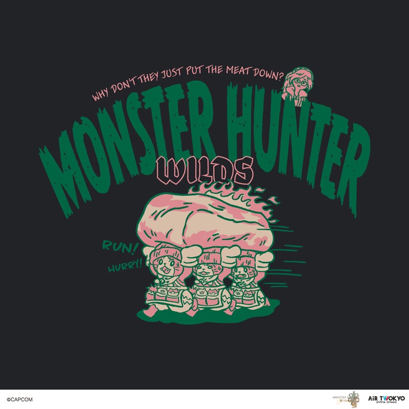 フロントには、モンスターからお肉を抱えて逃げるアイルーたちの姿を、かわいらしくユーモラスにデザイン。