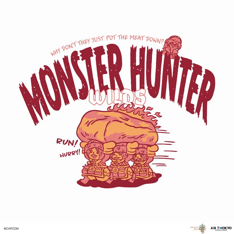 フロントには、モンスターからお肉を抱えて逃げるアイルーたちの姿を、かわいらしくユーモラスにデザイン。
